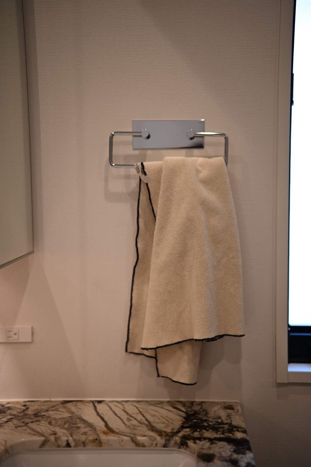 ペーパーホルダー・洗面のタオル掛けも、単なる付属品としてではなく、空間との比重をみて、バランスの良いものを選定。小さな空間だからこそ、こうした細部の積み重ねが、空間全体の印象を静かに引き上げてくれます。